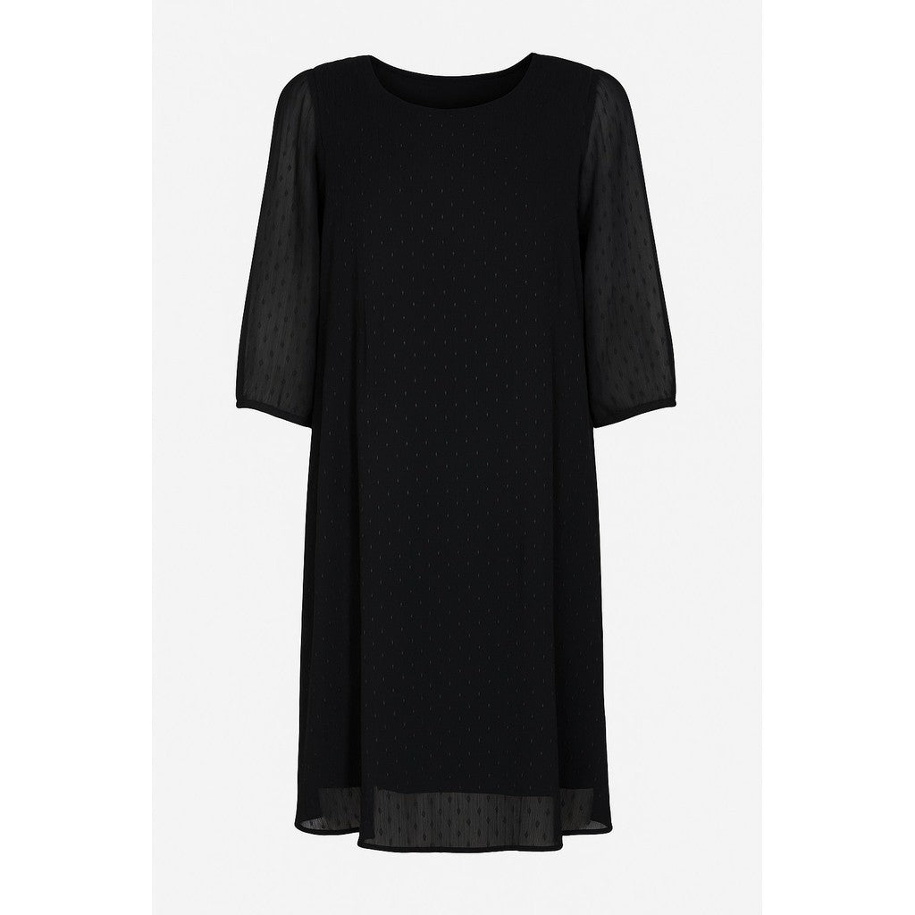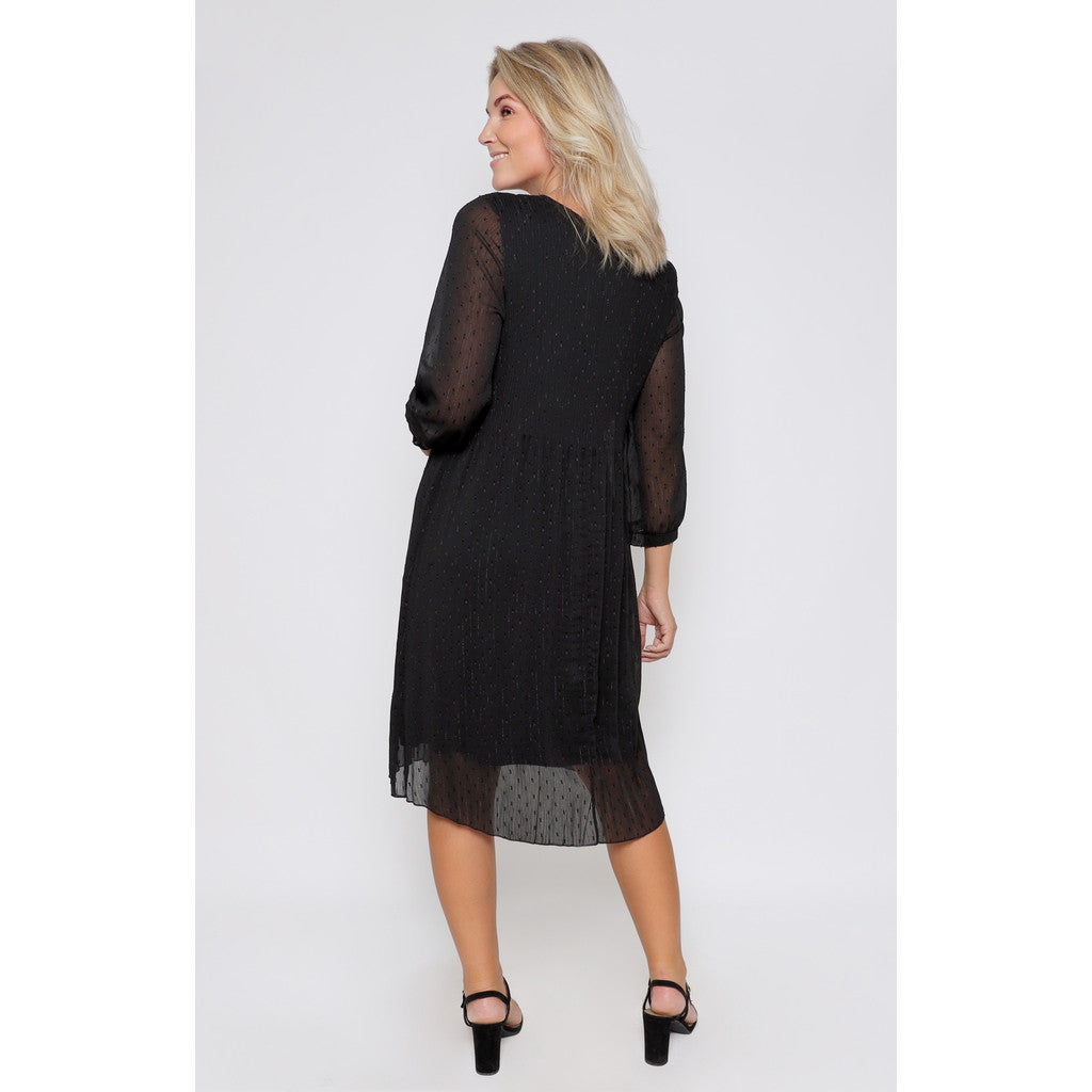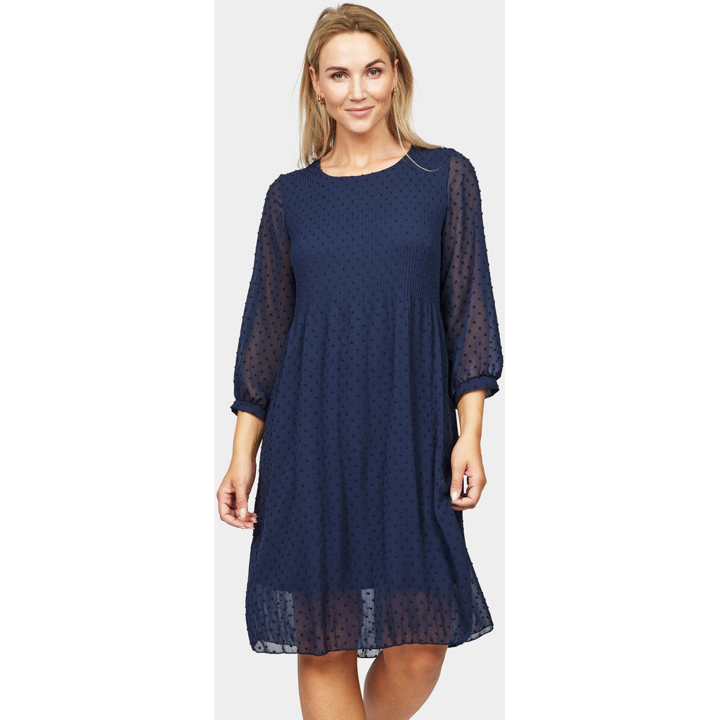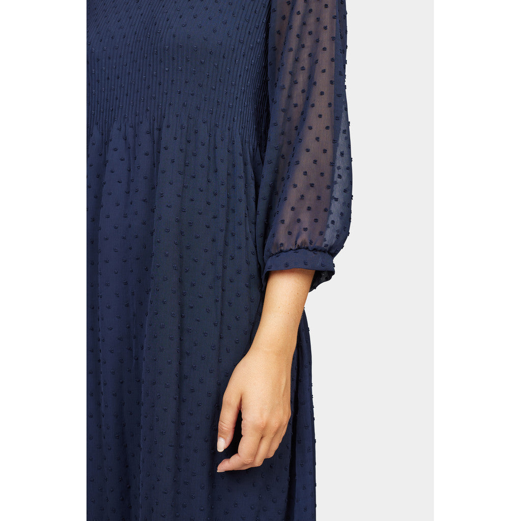 Juhlava pliseerattu tummansininen mekko jossa kauniit 3/4 läpikuultavat hihat. Mekko joustaa pliseerauksen ansiosta jolloin se on todella mukava päällä.