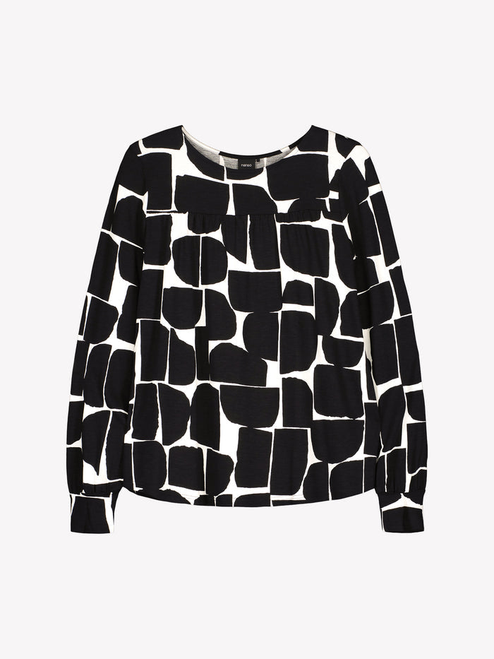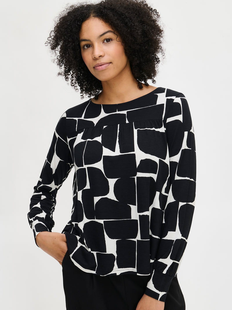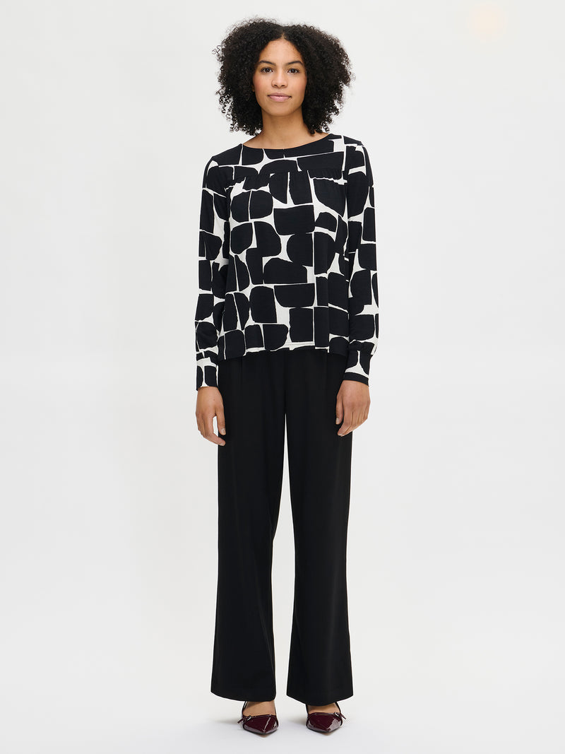 Väljä helmaisessa puserossa on kantilla huoliteltu pyöreä pääntie, kaarrokkeen leikkaussaumassa on poimutusta. Puseron täyspitkät hihat poimuttuvat kauniisti hihansuun kaitaleiden yläpuolelle. Kauniisti laskeutuvan puseron materiaali on laadukasta ja miellyttävän tuntuista viskoosi-elastaani-neulosta. Viskoosineulos on sähköistymätöntä ja helppohoitoista. Materiaalille on ominaista 3-5% kutistuminen ensimmäisessä pesussa.