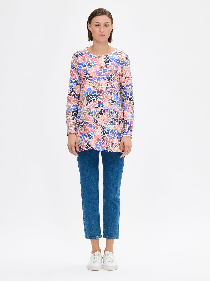 Nanson kaunis kuosillinen Sagitta-tunika. Trikootunika on niin arjen kuin vapaa-ajankin luottovaate, joka ilahduttaa monikäyttöisyydellään. A-linjaisessa tunikassa on tereellä viimeistelty pyöreä pääntie, sivuissa taskut ja täyspitkät hihat.