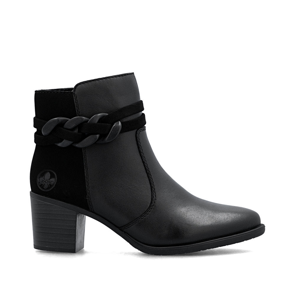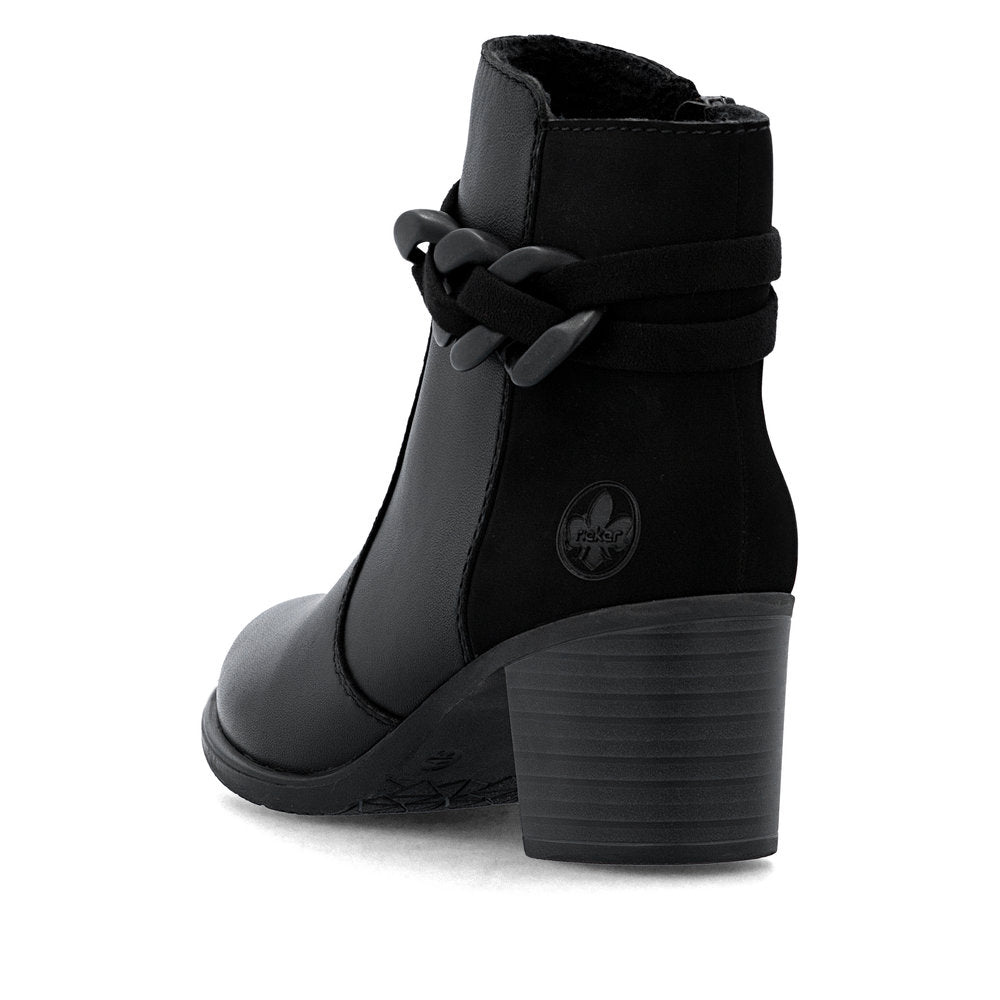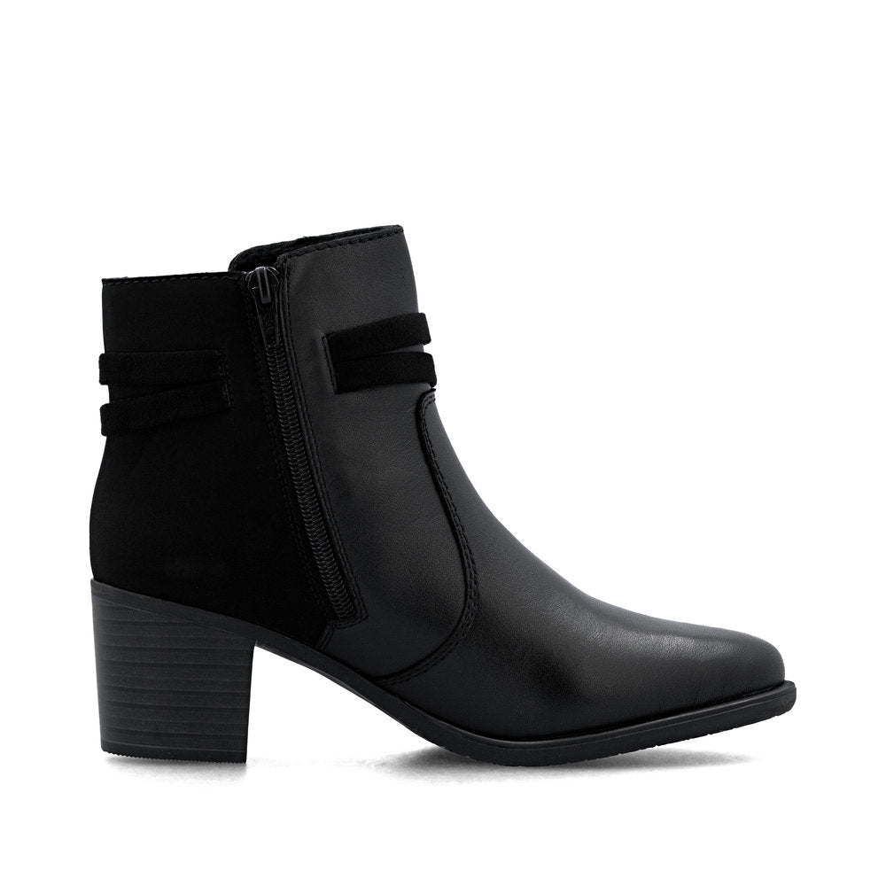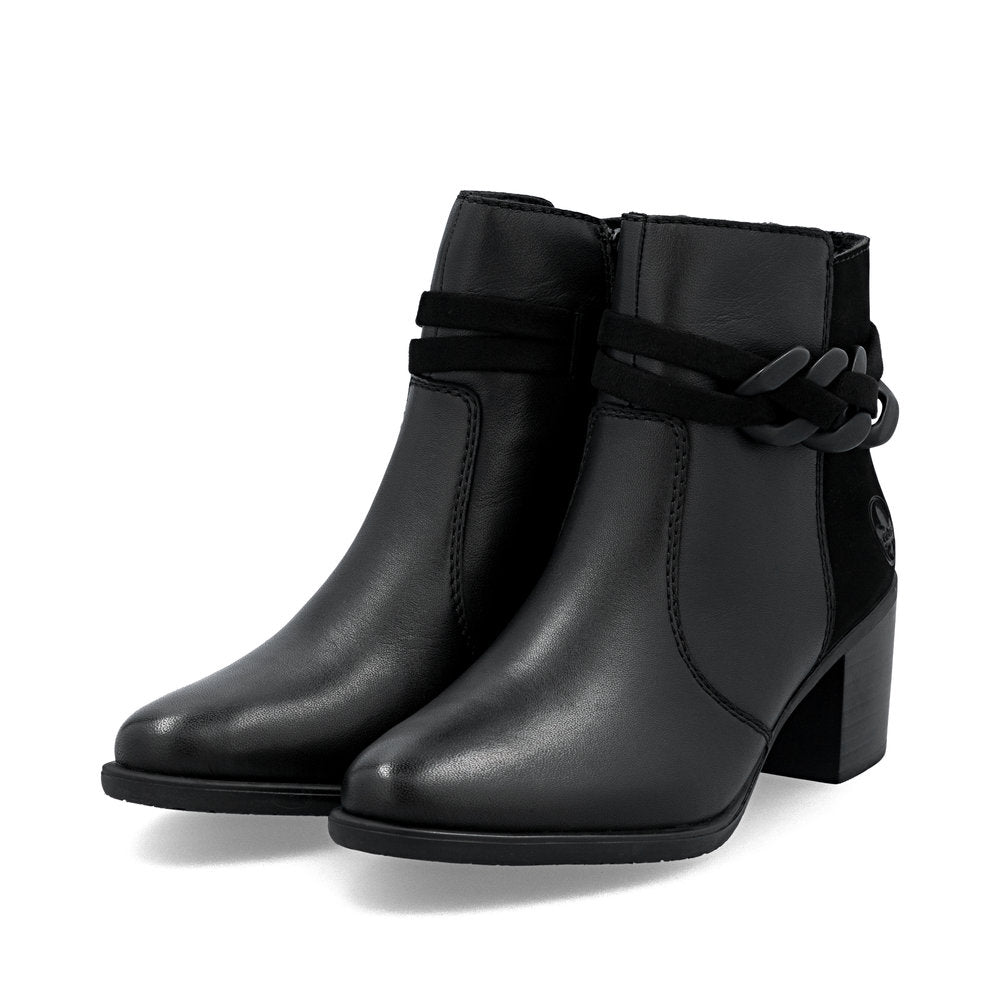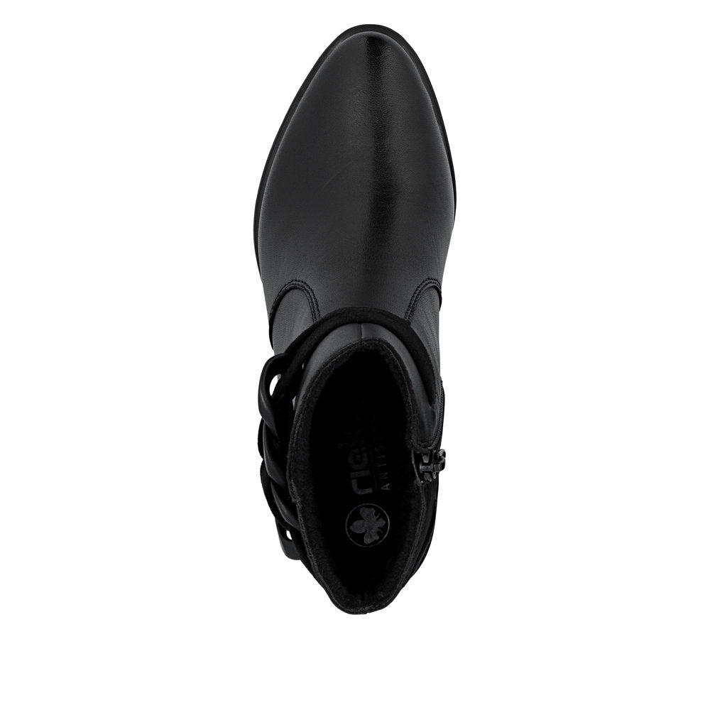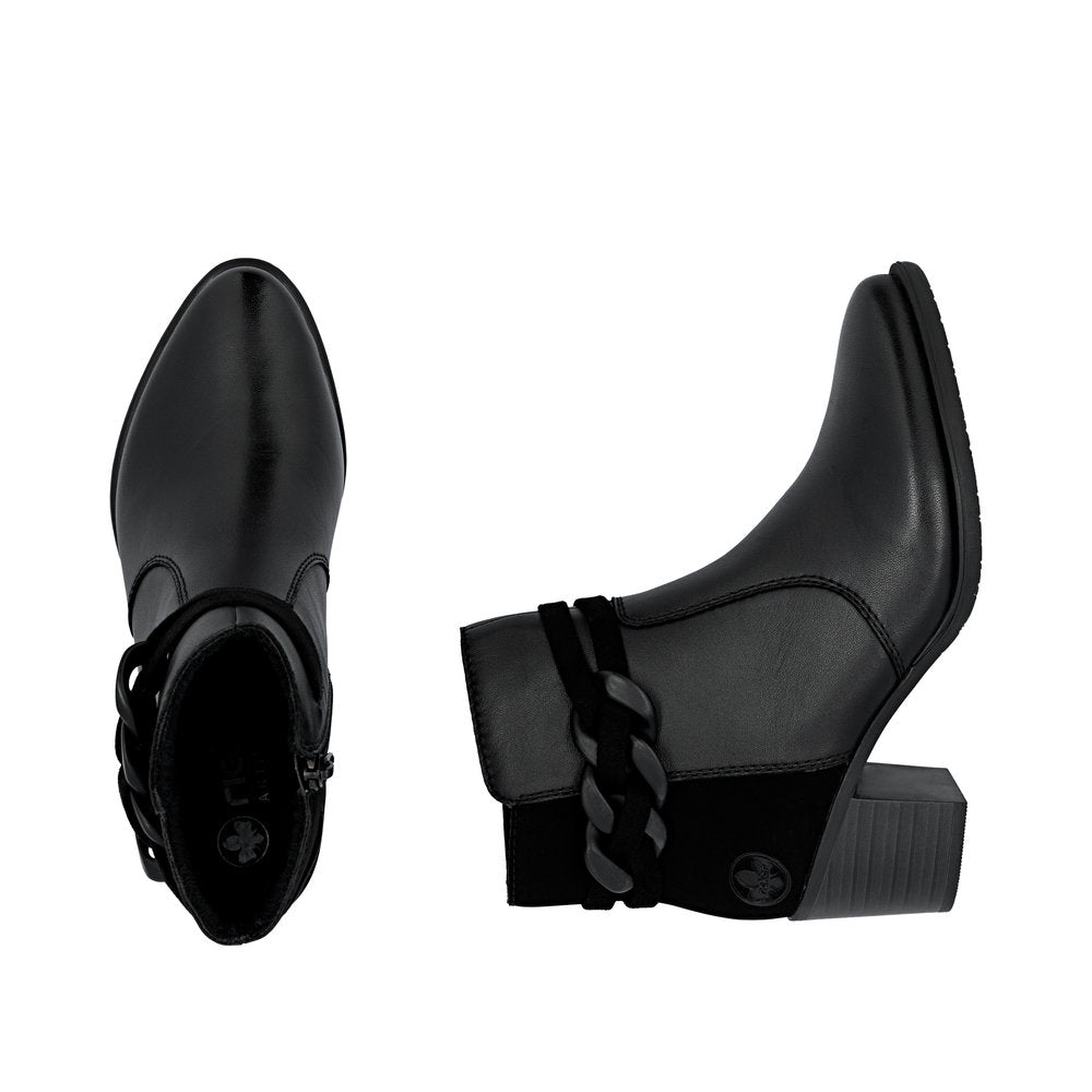 Nahkainen Rieker nilkkuri kauniilla yksityiskohdilla ja tolppakannalla. Mukavan tilava lesti ja pitävä kumipohja.